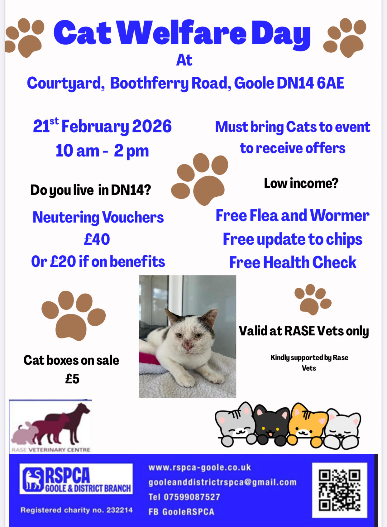 Must be over 18 and if possible, have transport for vet trips. We operate in the DN14 area but as long as willing to travel to our participating clinics End Cottage Vets Howden and Rase Vets Goole we can be flexible . Working with the public, at times the National RSPCA and partners, can be a challenging but ultimately rewarding experience.