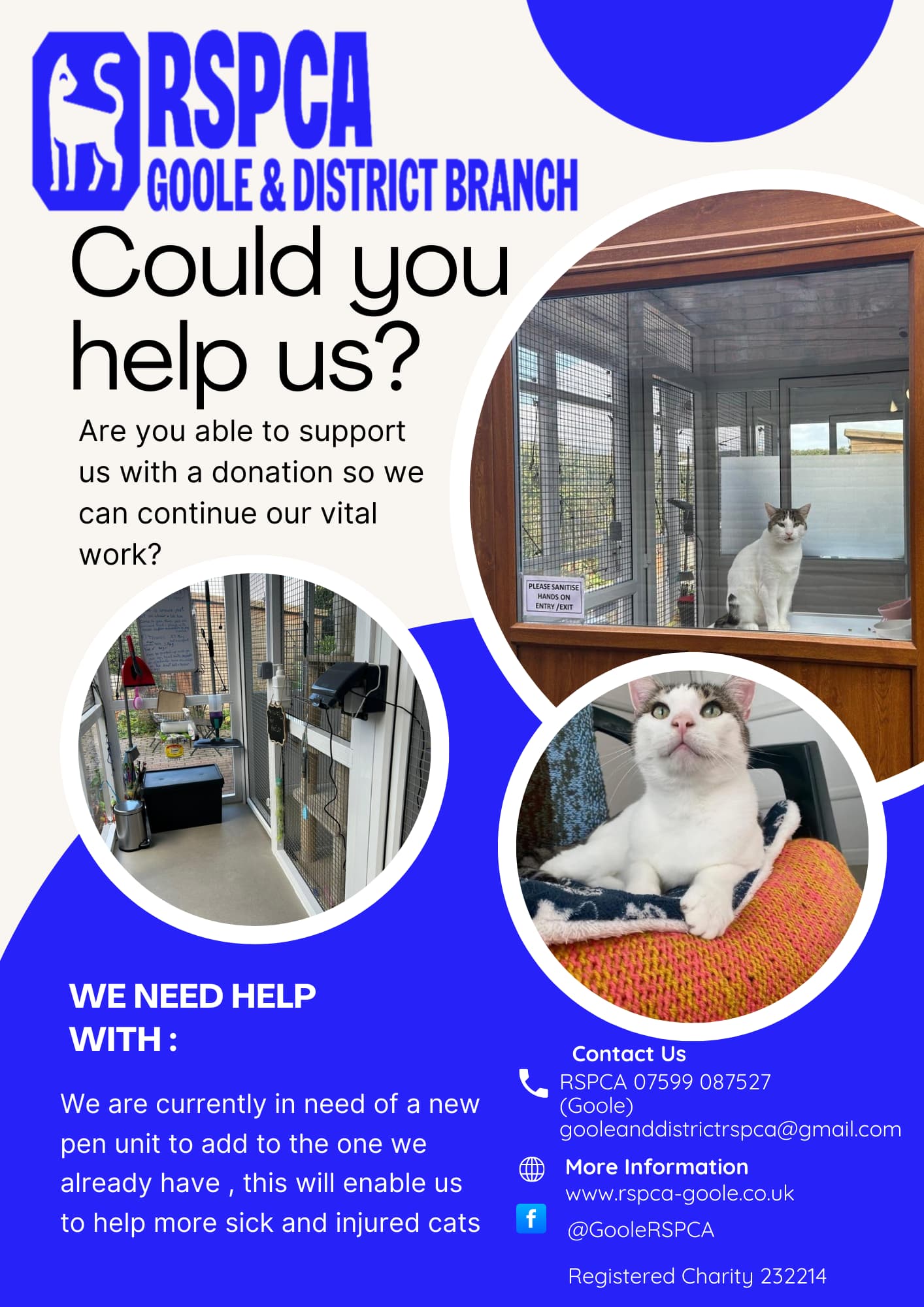 Must be over 18 and if possible, have transport for vet trips. We operate in the DN14 area but as long as willing to travel to our participating clinics End Cottage Vets Howden and Rase Vets Goole we can be flexible . Working with the public, at times the National RSPCA and partners, can be a challenging but ultimately rewarding experience. If you think you could offer a safe, nurturing and 'suppawtive' environment for fab felines in need, please contact gooleanddistrictrspca@gmail.com to find out more.
